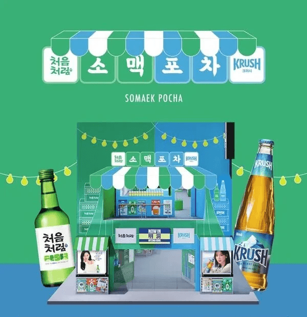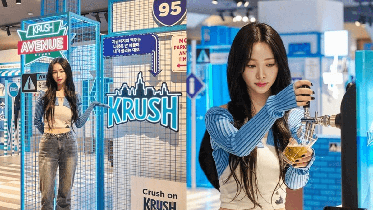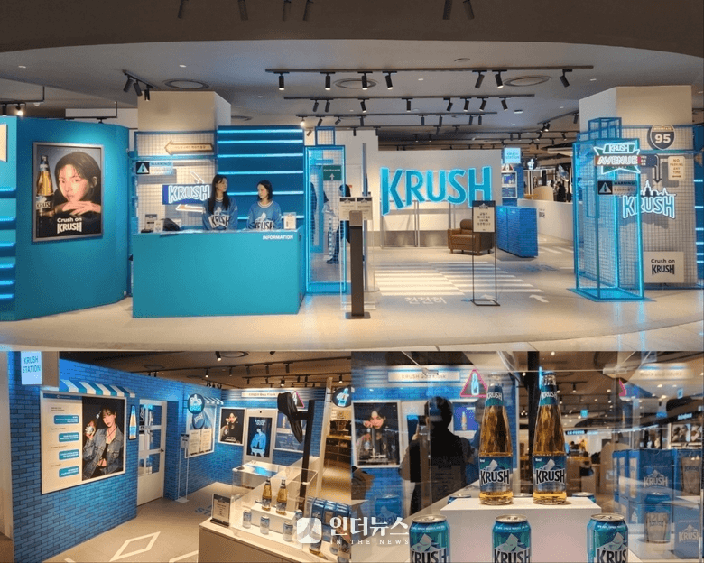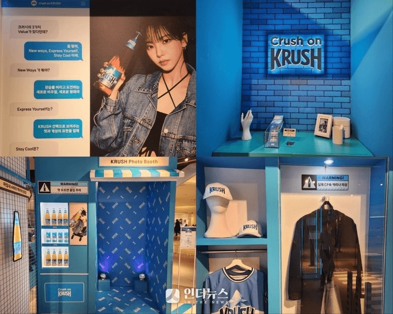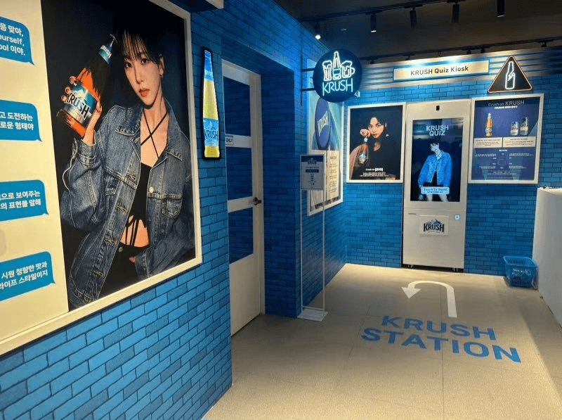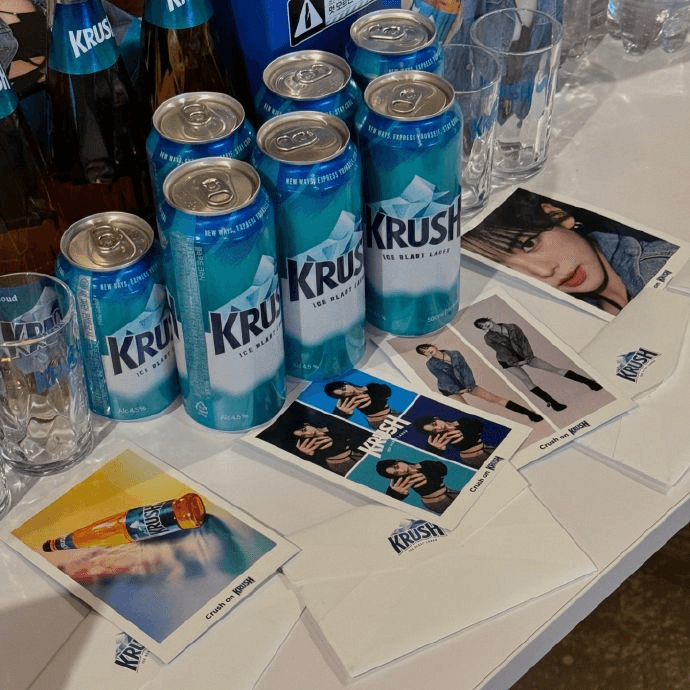 Krush collaborates with First Soju on a Pop-Up Store in Myeongdong on Aug 23rd - Sep 18th 2024. The event features KARINA's in their marketing collateral.